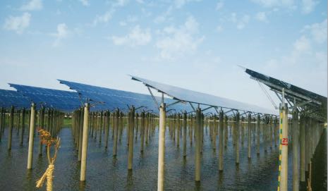 本項目位于余干縣三塘鄉(xiāng),由羲和EPC總承包建設(shè),2016年5月并網(wǎng)發(fā)電。項目地為自然水域,四面來水,積水和淤泥較深,施工難度大。工程采用水陸兩用高頻振動打樁機等多項措施,同時采用“邊試樁、邊打樁”方式精確確定管樁樁長。