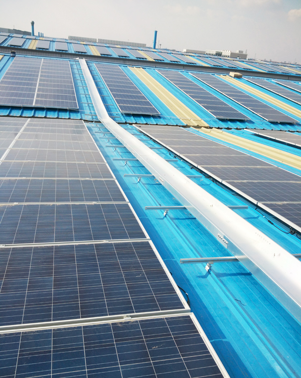 該項目位于江蘇省啟東市,利用企業(yè)廠房屋頂安裝光伏組件。因房屋荷載要求較高、廠區(qū)原水泥地坪不允許破壞、廠區(qū)消防要求較高、地下管網(wǎng)比較復(fù)雜等諸多建設(shè)條件限制,在組件、逆變器、升壓變、開關(guān)站等設(shè)備安裝布置及電纜敷設(shè)路徑等關(guān)鍵問題上進行了多次設(shè)計、施工方案討論,克服了諸多困難,是屋頂分布式光伏電站的經(jīng)典之作。