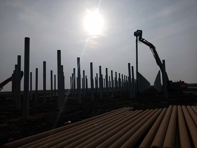 信義望江50MW光伏發(fā)電項目由信義光能(安徽)控股有限公司投資建設(shè),位于安慶市望江縣。建設(shè)用地為灘涂地,采用PHC400管樁為支架基礎(chǔ),單根管樁長度達(dá)到13-14米,因為防洪需求,管樁樁頂距地高度6-7米,以固定傾角方式及平單軸跟蹤式進(jìn)行安裝,計劃于2017年4月20日并網(wǎng)發(fā)電。由于場地地質(zhì)條件限制,規(guī)劃場區(qū)蓄水60-80cm,采用船打樁方案,確保施工要求。