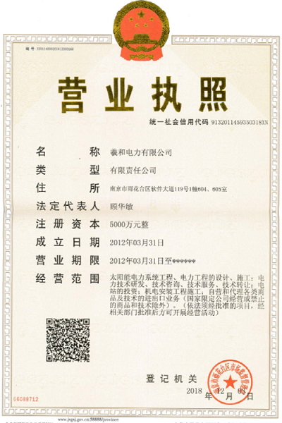 因業(yè)務(wù)發(fā)展需要,經(jīng)國家工商行政管理總局核定,自2018年12月03日起,“羲和太陽能電力有限公司”正式更名為“羲和電力有限公司”。公司注冊資本增資至5000萬元,經(jīng)營范圍涵蓋:太陽能電力系統(tǒng)工程、電力工程的設(shè)計、施工;電力技術(shù)研發(fā)、技術(shù)咨詢、技術(shù)服務(wù)、技術(shù)轉(zhuǎn)讓;電站的投資;機電安裝工程施工;自營和代理各類商品及技術(shù)的進出口業(yè)務(wù)。